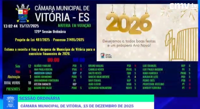 A Câmara de Vitória aprovou, na tarde desta segunda-feira (15), a Lei Orçamentária Anual (LOA) de 2026, que prevê receita de R$ 3,9 bilhões para a Capital no ano que vem. O projeto foi aprovado com 12 votos a favor e 5 contrários.
