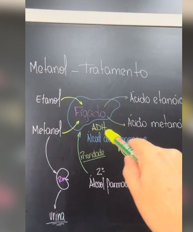 Ele explica que o etanol, quando estiver no sangue, irá para o fígado e será metabolizado por uma enzima, chamada de álcool desidrogenase e se transformará em ácido etanóico. O mesmo acontece com o metanol, a diferença é que ao ser metabolizado, ele forma o ácido metanoico. “Esse cara é o grande problema. Então, não podemos deixar ele ser formado”, explica.