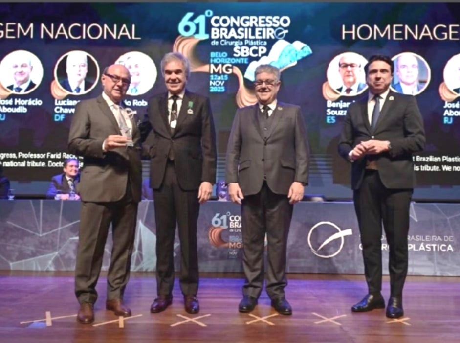 Conforme a Coluna HD já noticiou, foi realizado em Belo Horizonte o 61º Congresso Nacional de Cirurgia Plástica. Durante o importante encontro, o cirurgião plástico Benjamin Gomes foi homenageado com a Comenda Nacional da Cirurgia Plástica. A entrega do troféu foi feita por Volney Pitombo, presidente da entidade (foto).