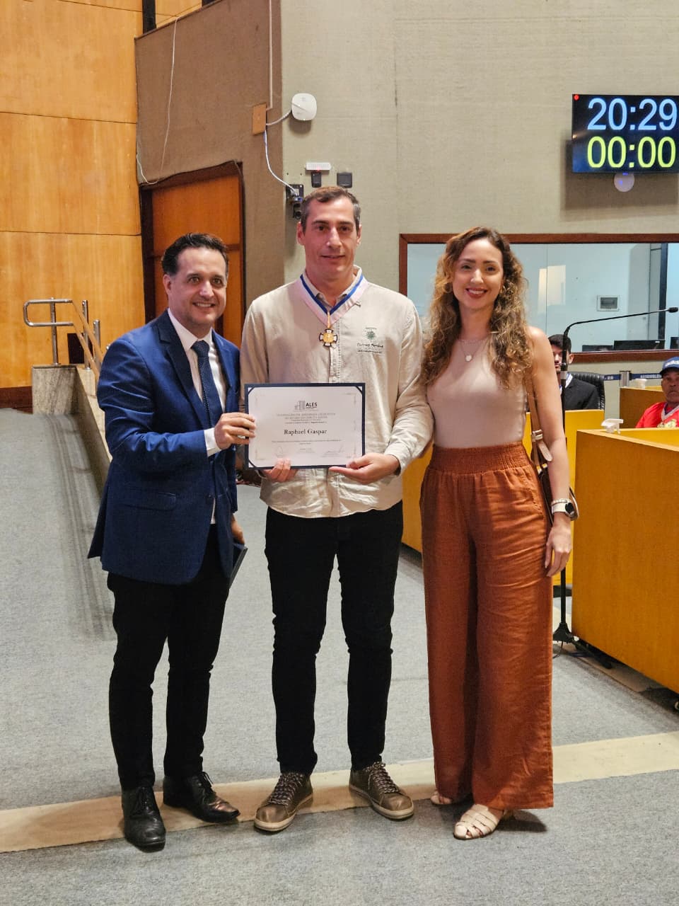 O diretor do Instituto Últimos Refúgios Raphael Gaspar recebeu nesta semana na Assembleia Legislativa do Espírito Santo a Comenda Augusto Ruschi, a maior honraria relacionada à causa ambiental do Estado. Na imagem: deputado estadual Fabrício Gandini, Raphael Gaspar e a esposa Carla Roberty.