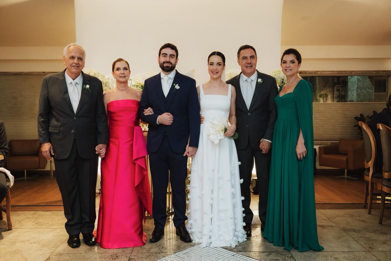 Jose Luiz e Angela Cunha, Alexandre e Sabrina Grafanassi ladeando os filhos e noivos Ana Carolina e Matheus, que protagonizaram casamento intimista no Lareira Portuguesa.