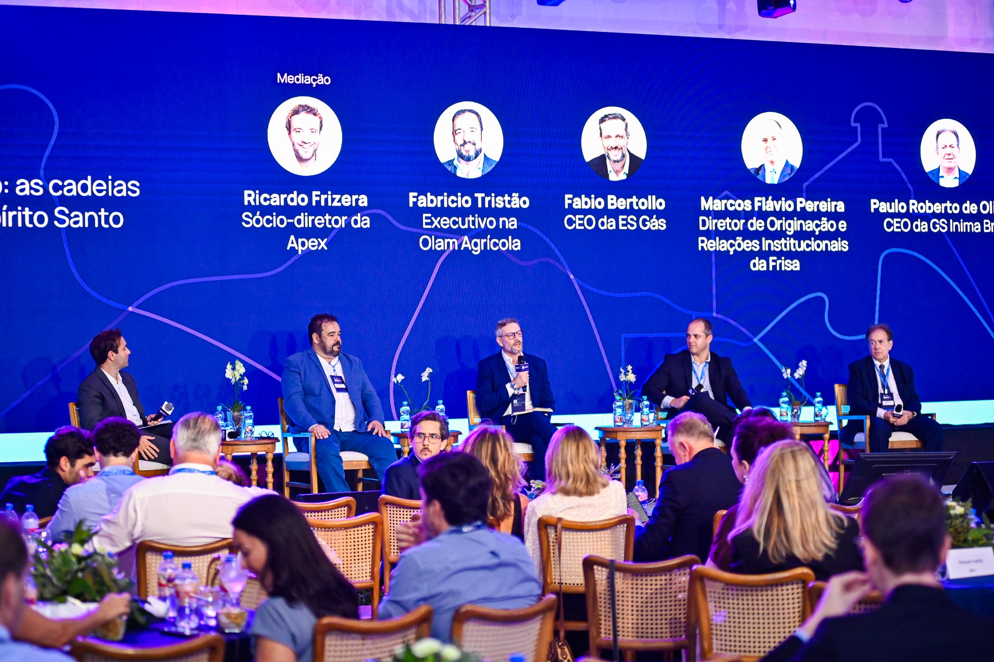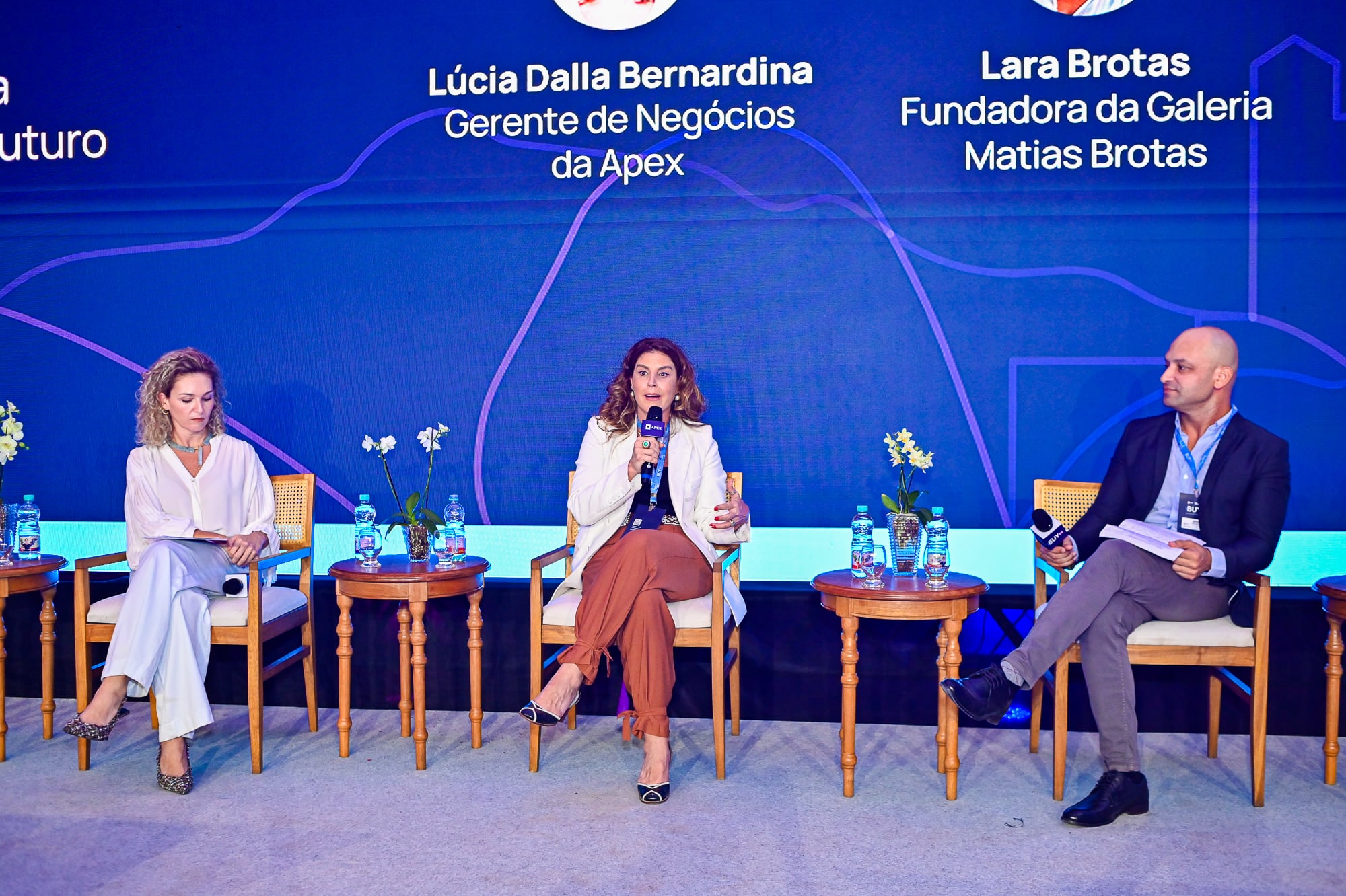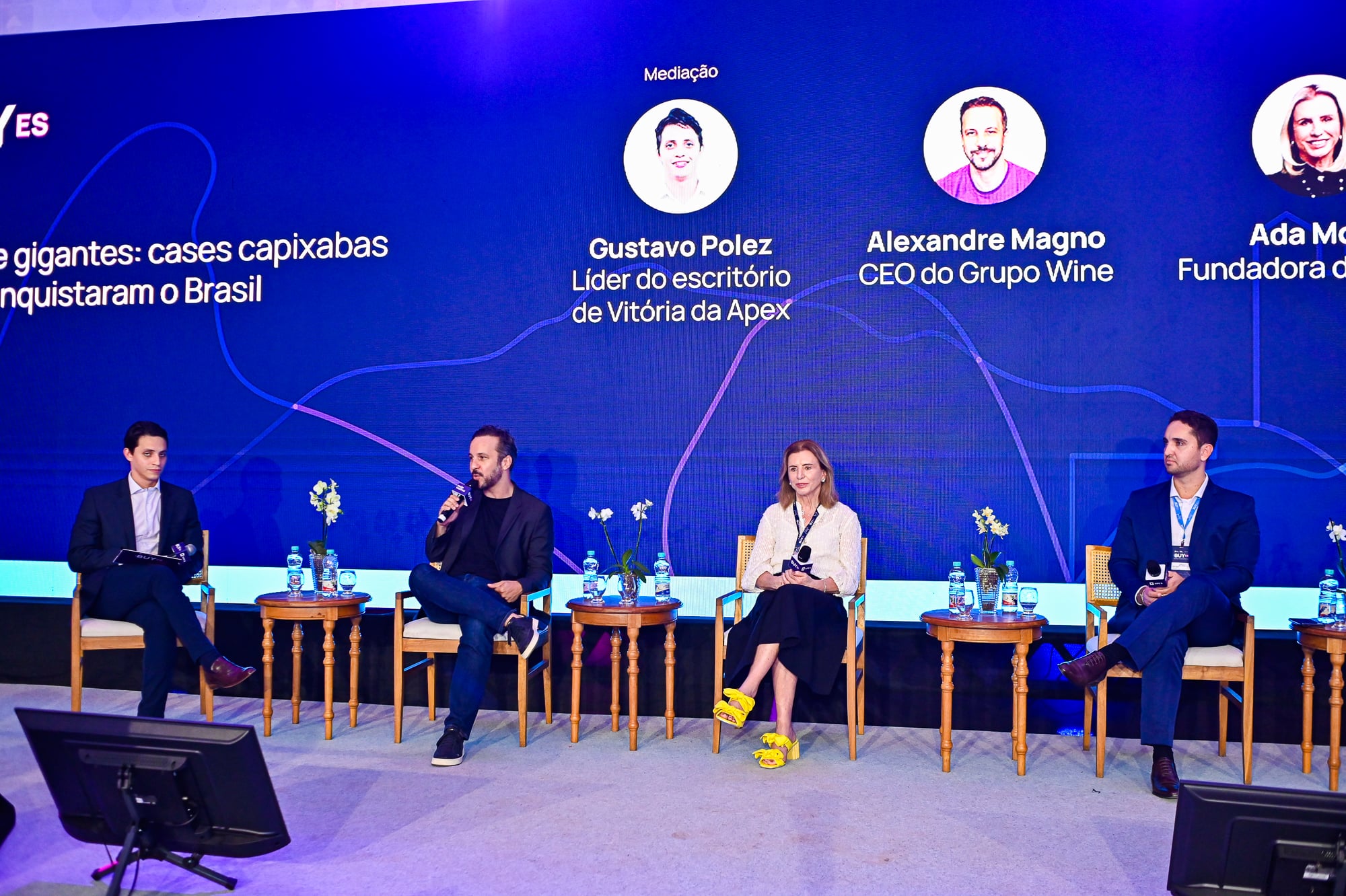 Felipe Caroni, Bruno Chieppe e Juliana Tommasi: ouvindo as lideranças da economia durante o Buy ES , no Cais das Artes. Foto: Arthur Louzada
