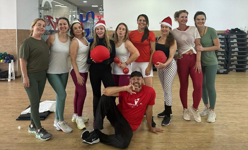 Aída Cruz, Renata Duarte, Renata Davies, Regina Dalla Bernardina, Beth Duarte, Cris Conde, Elisa Coelho, Marcella Surlo e Paulo Balbino: clima natalino para ginástica localizada na Vitória Sports.