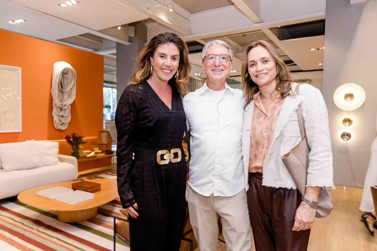 Lara Brotas com Salomão Crosman e Gaby índio da Costa na abertura da mostra “Através do Vidro – A alma das cores”, no novo ambiente no Casashopping, no Rio.