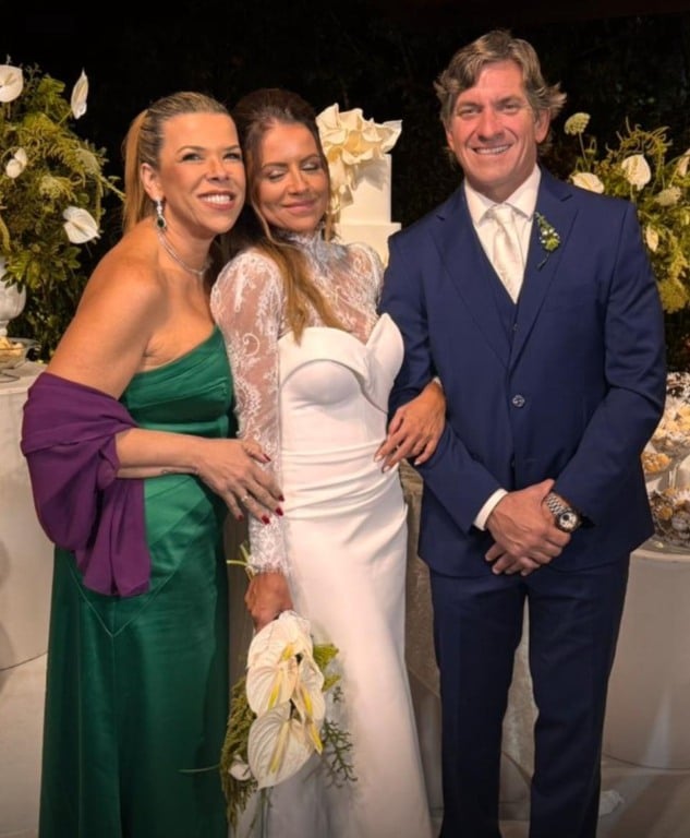 Karla Bastos com a prima, Fatinha Barcelos, e o noivo, Fabricio Fontana, sábado, na Pousada Pedra Azul.