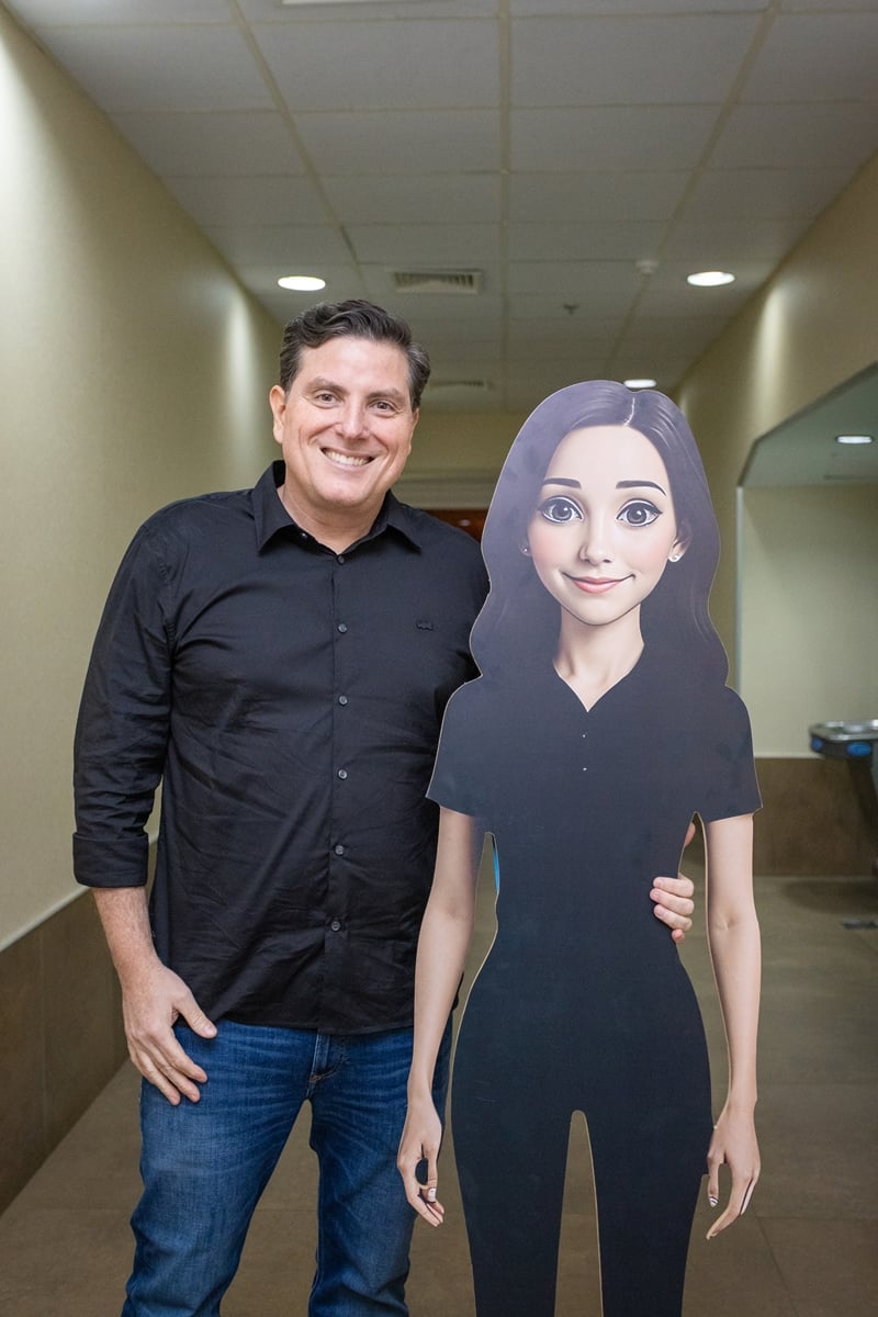 O CEO da Nazca, Breno Peixoto, ao lado da Iza, no Cinemark Shopping Vitória. Iza é a nova ferramenta de Inteligência Artificial exclusiva para corretores de imóveis desenvolvida pela incorporadora, totalmente codificada e personalizada para atender às necessidades dos profissionais do setor. Foto: Alex Gouvea