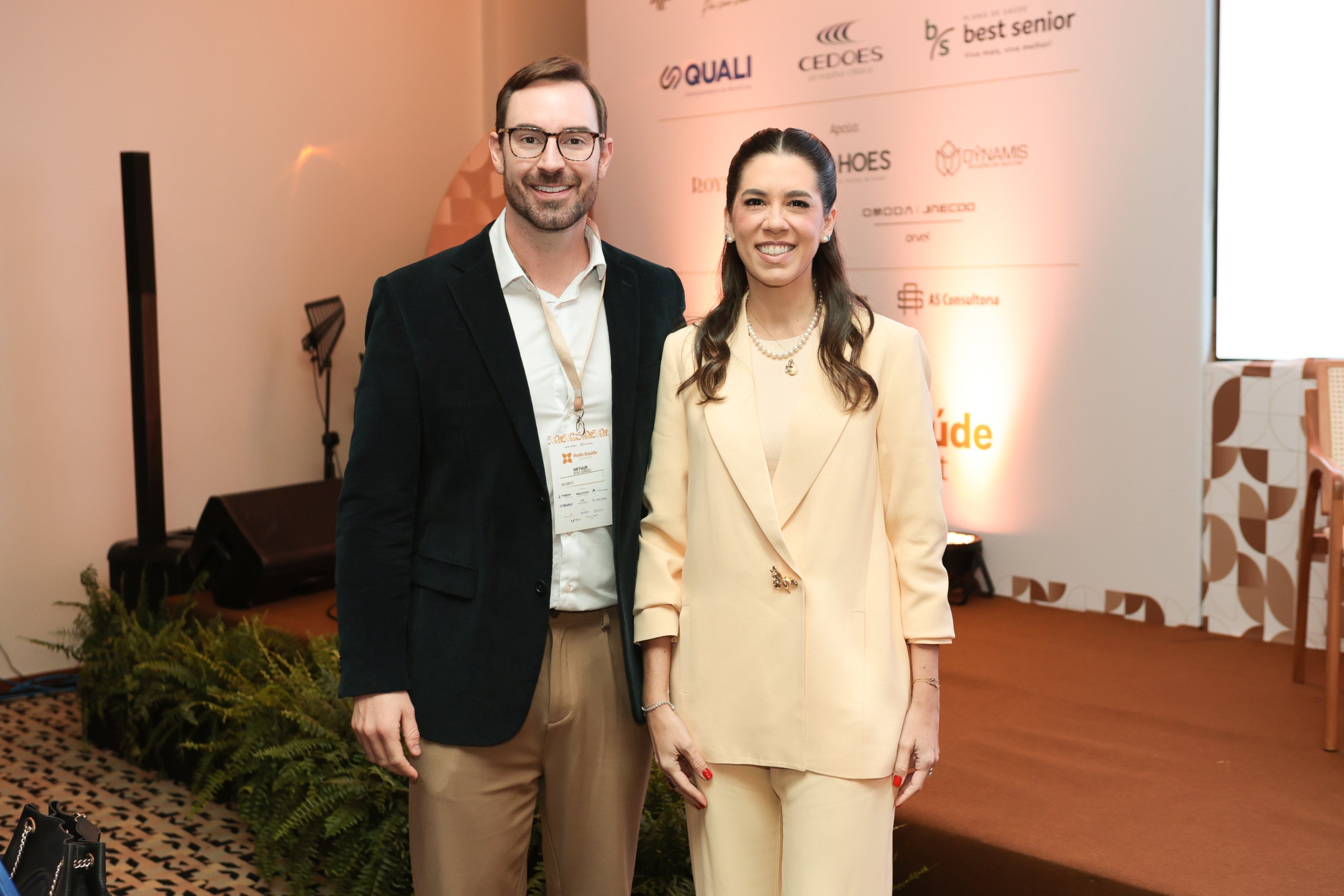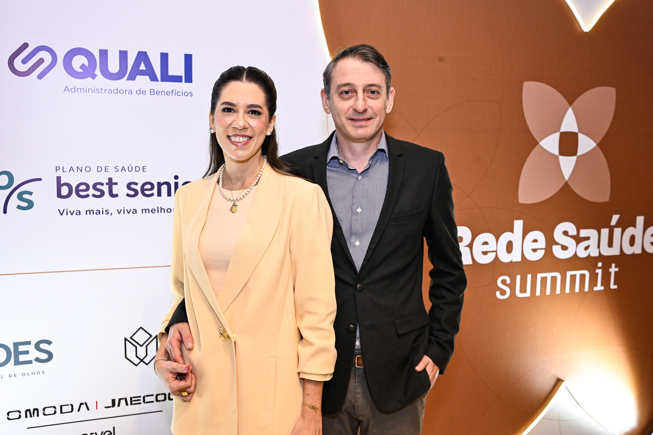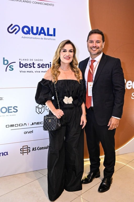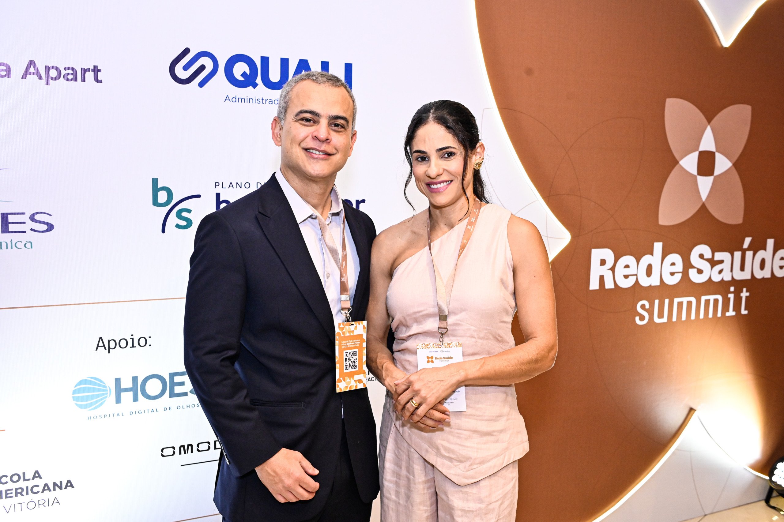 Priscila Passamani, chiquíssima de La Bassetti, e o marido, Flavio Cirilo, no Saúde Summit, da Rede Vitória. O evento abordou a utilização da Inteligência Artificial na otimização de processos e aperfeiçoamento de serviços e o produtos no setor de saúde.