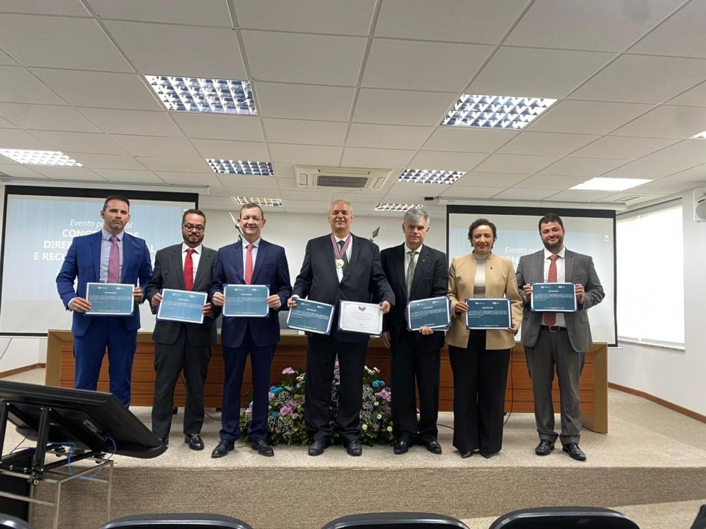 Na foto: Juiz Federal Dr. Aylton Bonomo, Gustavo Nobre, presidente do IBDE, Bruno Finamore, Desembargador do TJES Dr. Namyr Carlos de Souza, Desembargador do TJES Dr. Júlio César Costa Oliveira, Erica Neves, presidente da OAB/ES e o Professor Thiago Siqueira.