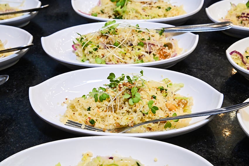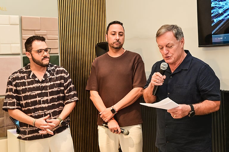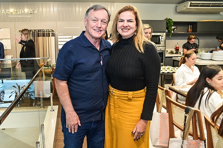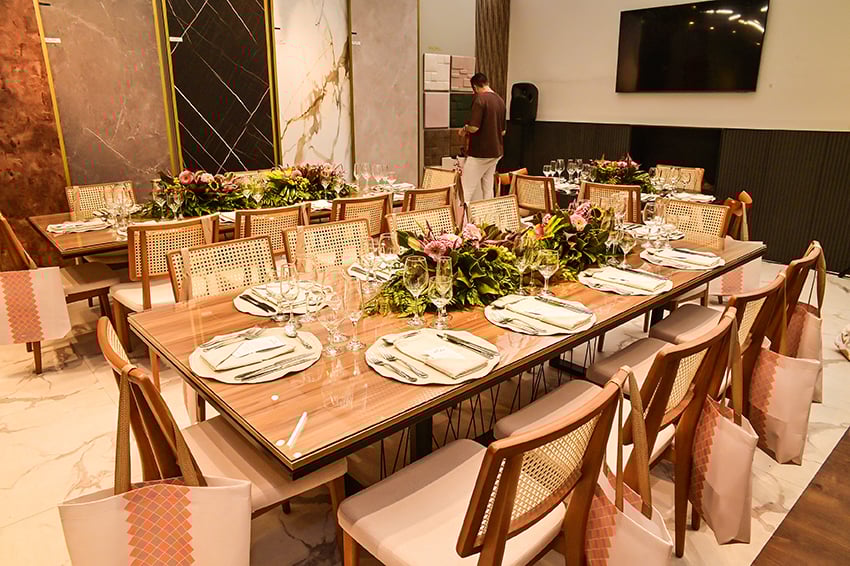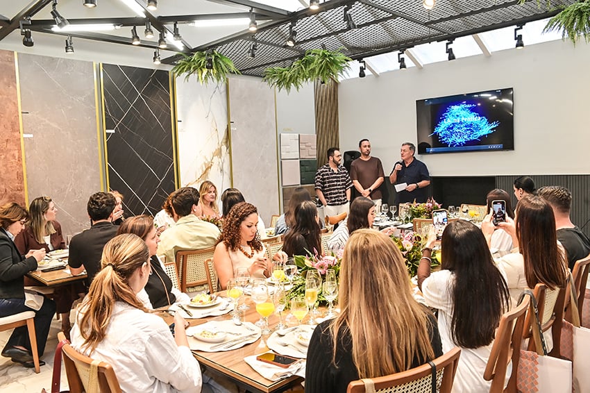Dando continuidade aos encontros em torno da boa mesa na Composé, Carlos Marianelli os curitibanos Zeh Pantarolli e Diego Miranda, arquiteto e designer, respectivamente, fundadores do Estúdio Pantarolli Miranda. A dupla falou para profissionais do mundo décor sobre o uso da inteligência artificial no setor. A chef Karla Brandão assinou o menu: Caesar Salad, cuscuz marroquino, arroz de maracujá com camarão ao catupiry, farofa panko e musseline de baroa com mignon ao molho Malbec.