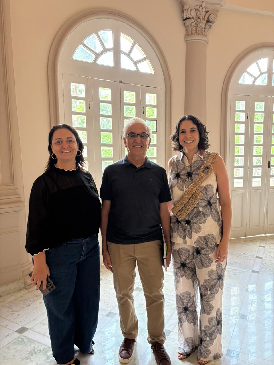 A diretora do Instituto Modus Vivendi, Tatiane Alvarenga, e o arquiteto José Daher, com a presidente do Cau/ES, Priscila Ceolin: visita técnica promovida pelo Conselho ao Theatro Carlos Gomes, em celebração ao Dia do Arquiteto.