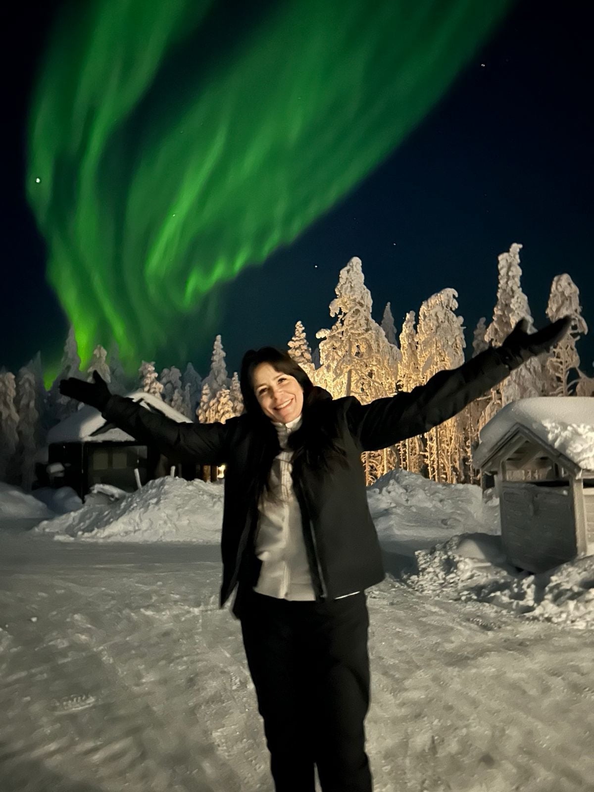 Aparecida de Oliveira fascinada com a Aurora Boreal que brilha no céu da Finlândia