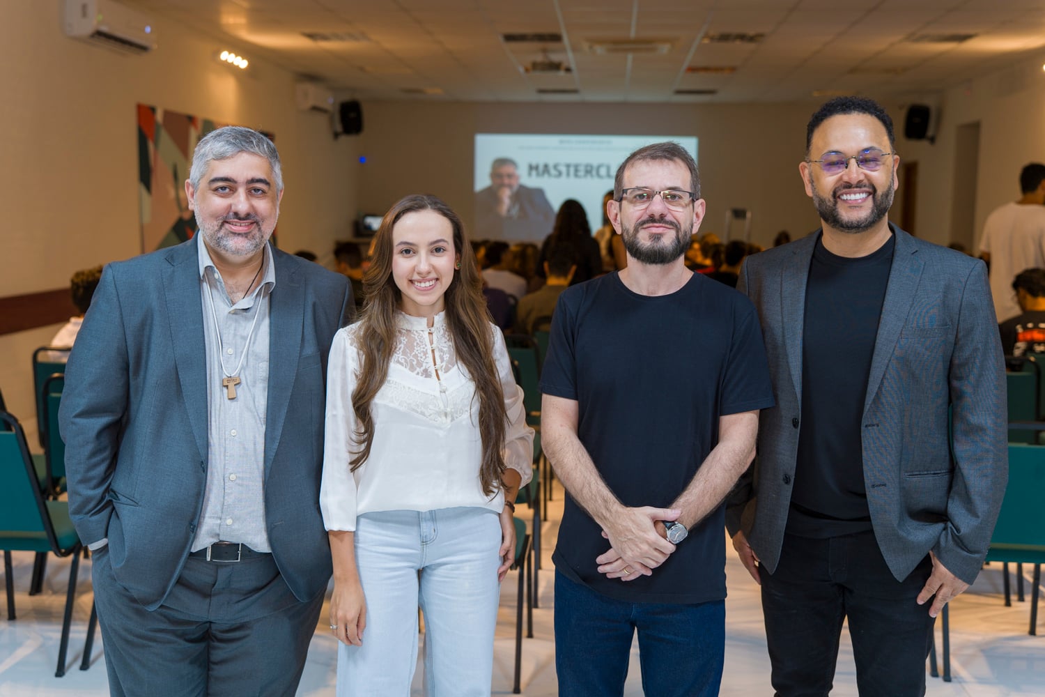 O cardiologista Leandro Rua, Alice Del Puppo, Fabricio Gaburro e Walter Fagundes (foto) no encontro Master Class ECG com Sentido, realizado no auditório da Associação Médica do Espírito Santo, presidida por Fabricio. Auditório lotado e
