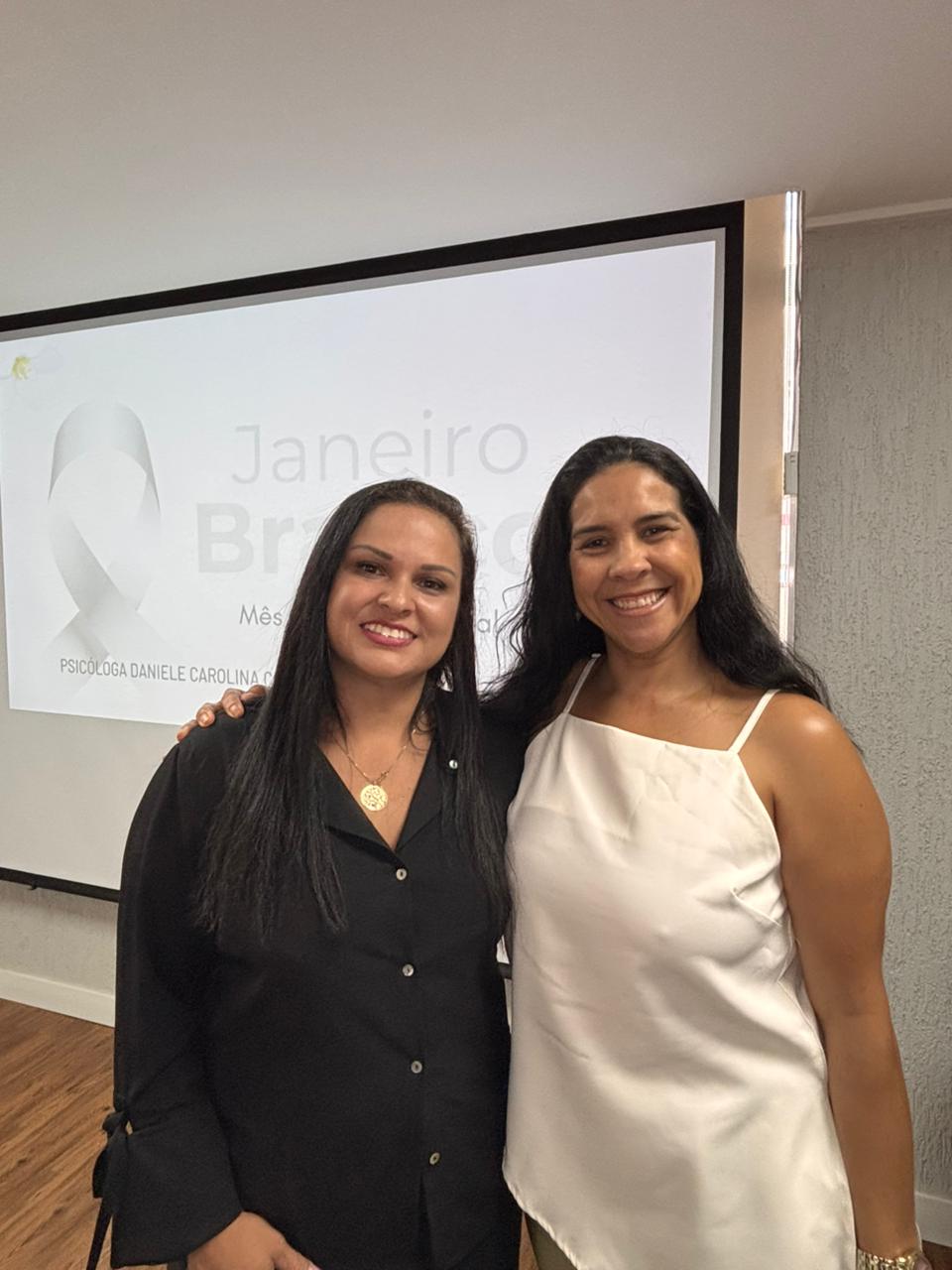 A psicóloga Daniele Carolina Cesar Zene e a gerente de Humanização Organizacional da operadora capixaba de internet Loga, Valquiria Pereira. Elas palestraram sobre saúde mental para os colaboradores da operadora.