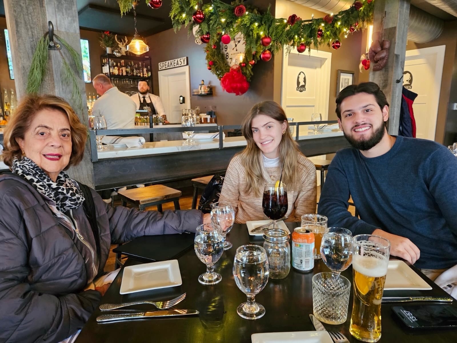 Licia Leal Santos, Ana Luisa Pelição e Arthur Santos Tommasi jantando no Guilford, em Connecticut