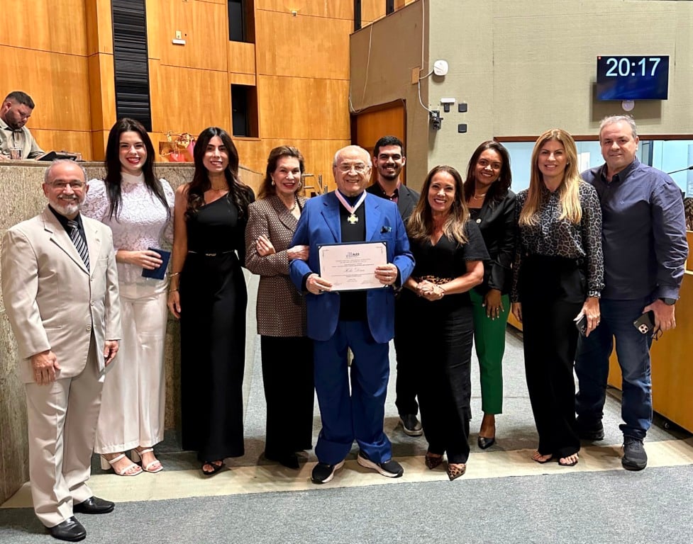 Helio Dórea recebendo a Comenda através da deputada Janete de Sá, ao lado da família