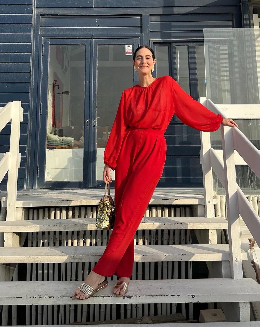 A influenciadora Vic Ceridono escolheu a flat Sil Champagne, da Manolita, para dia de festa em Costa da Caparica, Portugal, co look Candy Brown. Nâo é a primeira vez que ela usa o modelo para ocasião habilllé.