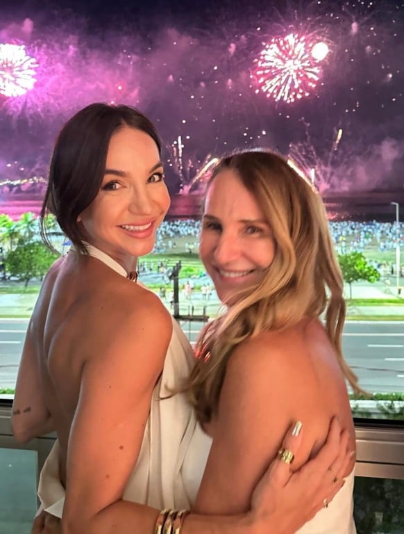 Solana e Carla Marianelli juntinhas, curtindo os fogos da virada do ano na varanda de casa.