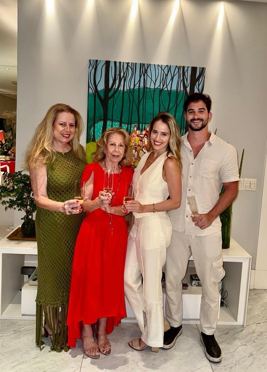 Com todo seu savoir faire Sandrinha Fonseca, sua mãe Liseta e a filha Manu abriram seu belo apartamento na Enseada para celebrarem en petit comité a ceia de Natal. Na foto, Sandrinha, Liseta e Manu com o noivo Vitor Leite (foto).