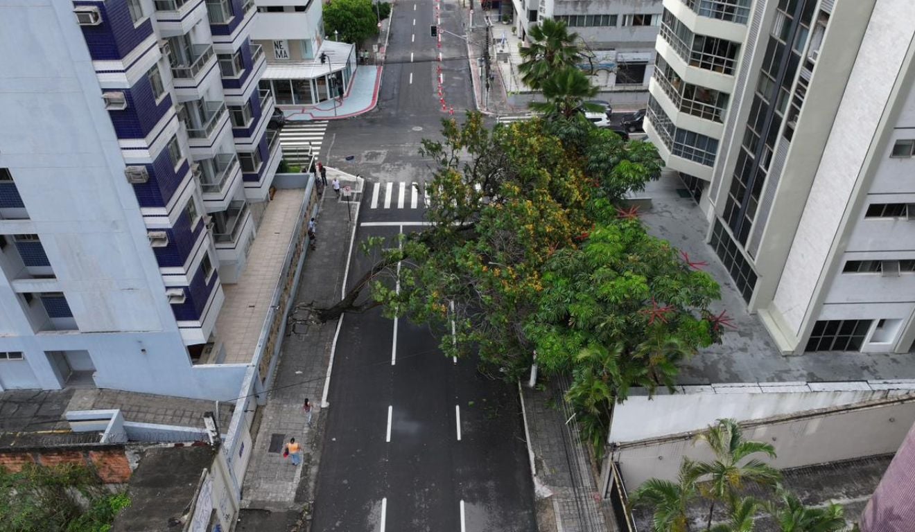 Ao cair, galhos da árvore atingiram um condomínio do outro lado da rua. A árvore ficou atravessada na avenida, interditando o trecho entre as ruas Castelo Branco e Quinze de Novembro.