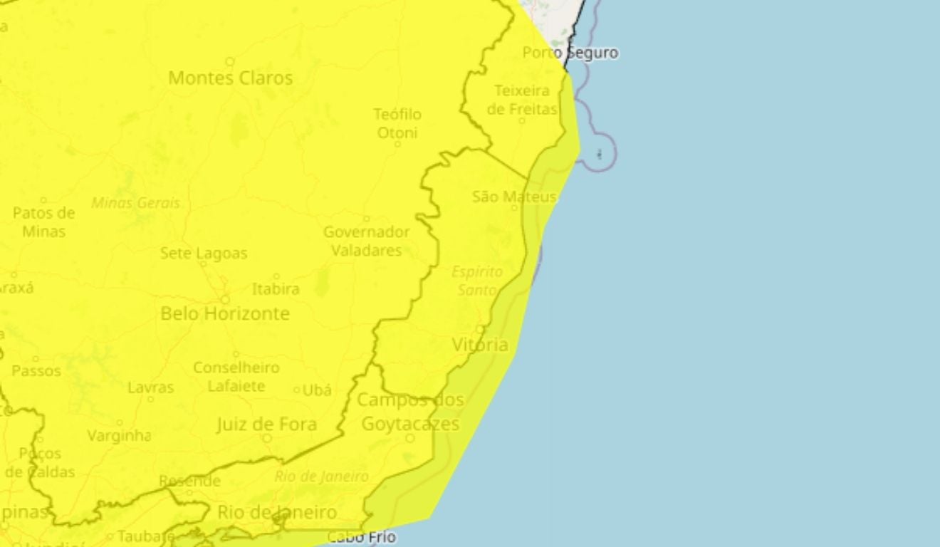 O Inmet emitiu um outro aviso para o Espírito Santo, de chuvas intensas, na cor amarela, que indica perigo potencial. Esse alerta meteorológico afeta todas as cidades capixabas e adverte para riscos potenciais de chuvas e ventos intensos.