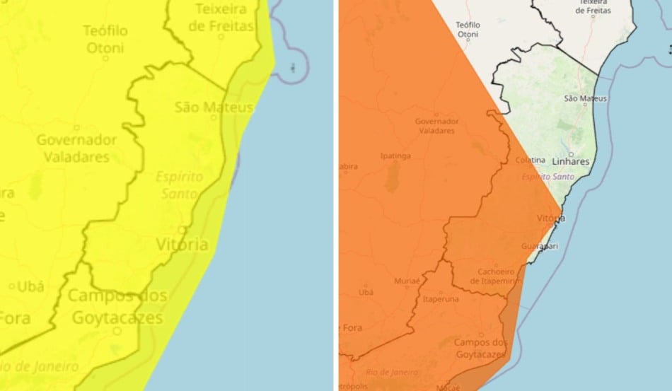O Inmet emitiu um outro aviso para o Espírito Santo, de chuvas intensas, na cor amarela, que indica perigo potencial. Esse alerta meteorológico afeta todas as cidades capixabas e adverte para riscos potenciais de chuvas e ventos intensos.