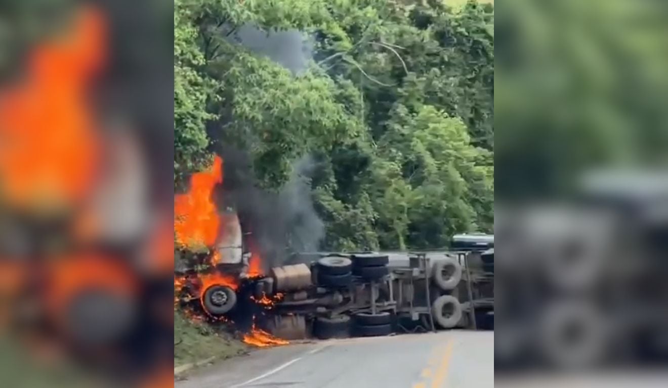 Um vídeo mostra a carreta atravessada na rodovia e um incêndio na cabine, próximo à vegetação local.