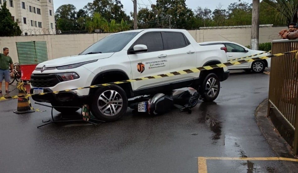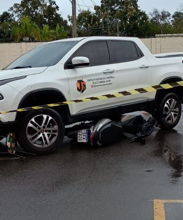 Uma motociclista de 43 anos, identificada como Danielle da Luz Magnago, foi atropelada por um carro na entrada de um condomínio na Serra. Imagens de câmeras do condomínio mostram que o veículo branco chega a passar por cima da vítima.
