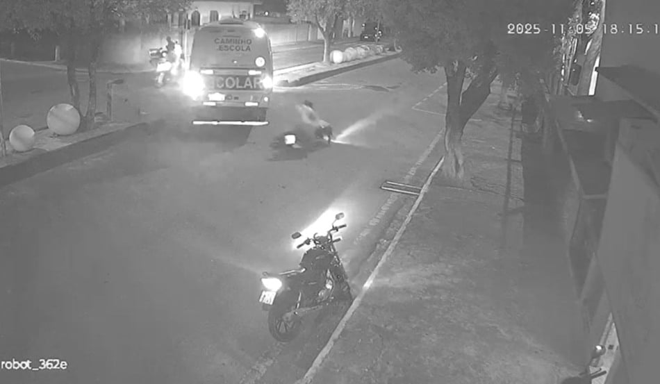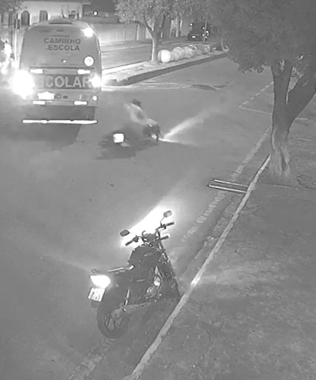 Um motociclista ficou gravemente ferido após bater em um ônibus escolar na noite desta quarta-feira (05) na Avenida Governador Lindenberg, no Centro de Jerônimo Monteiro, região do Caparaó capixaba. Imagens de câmera de segurança mostram o momento do acidente.
