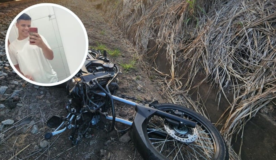 Com o impacto, a moto foi lançada sobre a linha férrea que passa ao lado da rodovia e acabou sendo atingida por uma locomotiva que transportava minério.