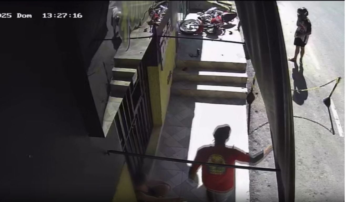 As imagens de videomonitoramento mostram o momento em que a motocicleta desce a rua, sai do controle e atinge os estabelecimentos. O piloto da moto e a pessoa que estava na garupa sofreram ferimentos leves.