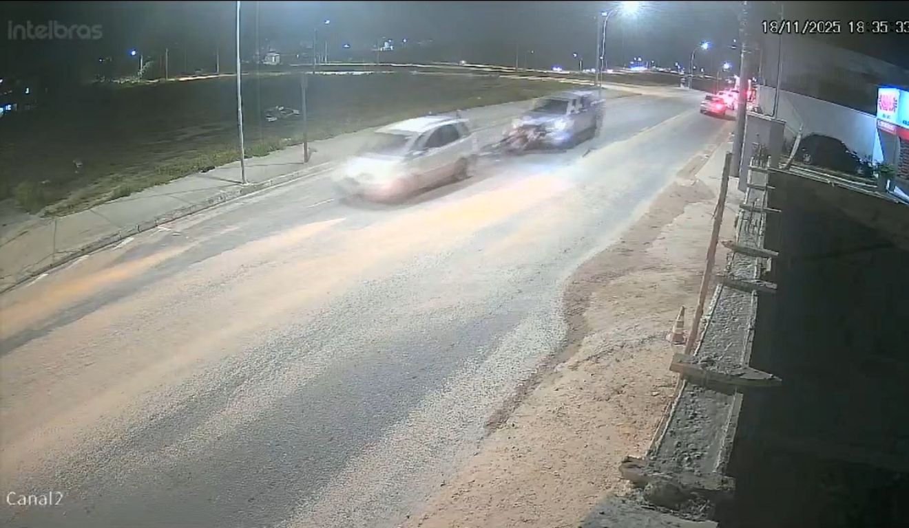 Imagens registradas por câmeras de segurança mostram que o fluxo de veículos seguia normalmente até o momento em que a caminhonete colide violentamente contra a moto. Com o impacto, o motociclista cai na pista.