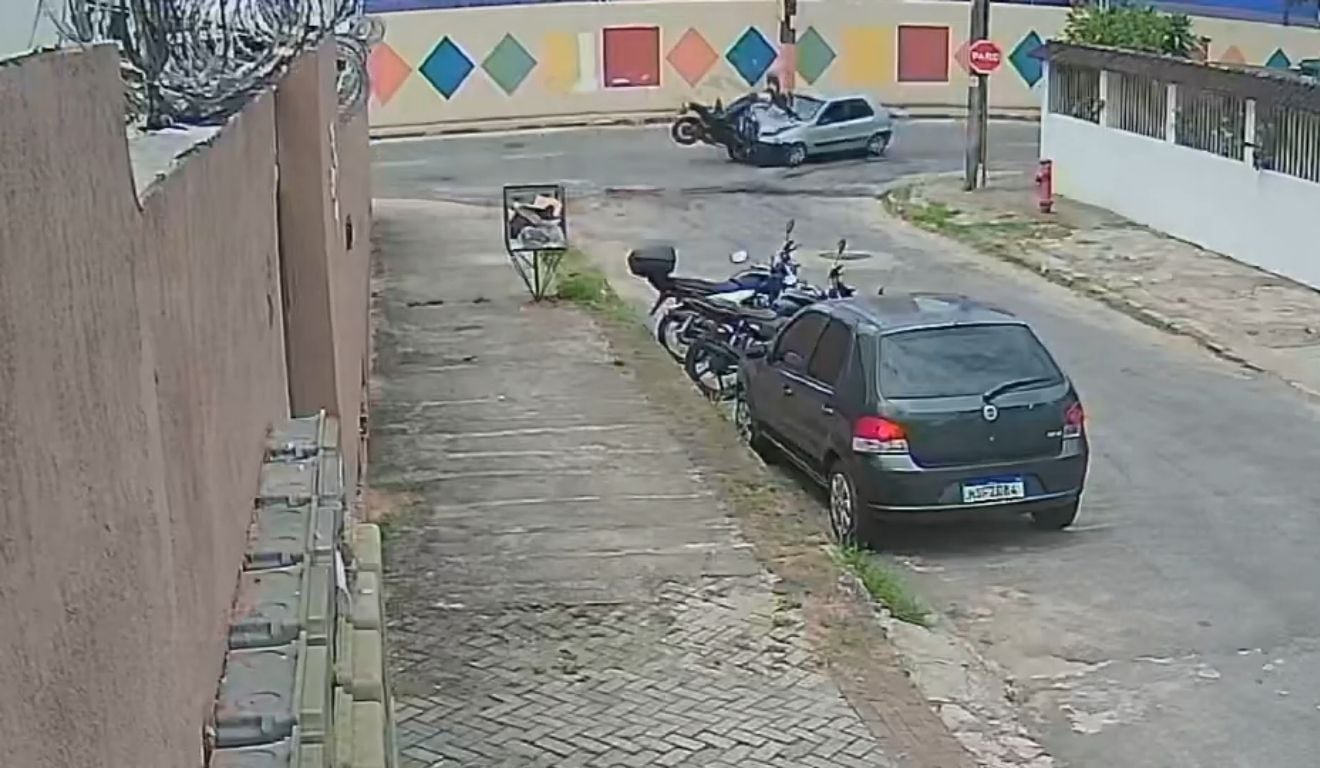 Um motociclista girou no ar antes de cair na pista, após colidir com um veículo prestes a entrar em uma rua lateral, na quarta-feira (17), no bairro Lagoa Funda, em Guarapari. O acidente aconteceu por volta das 13h30.