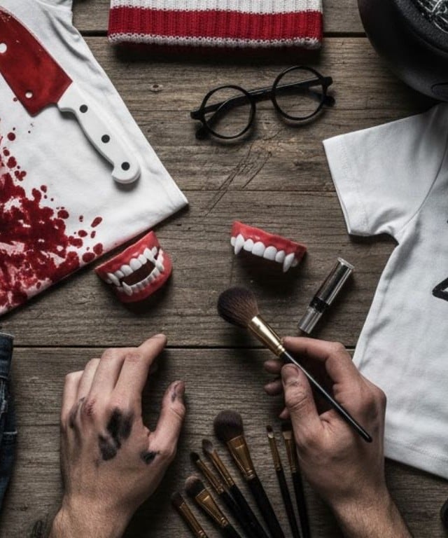- Maquiagem de efeito: A maquiagem de terror é o grande diferencial. Use lápis de olho preto, sombra escura ou até mesmo café solúvel misturado com água para criar um efeito de sujeira, olheiras profundas e cansaço (perfeito para Zumbi ou Coringa).
