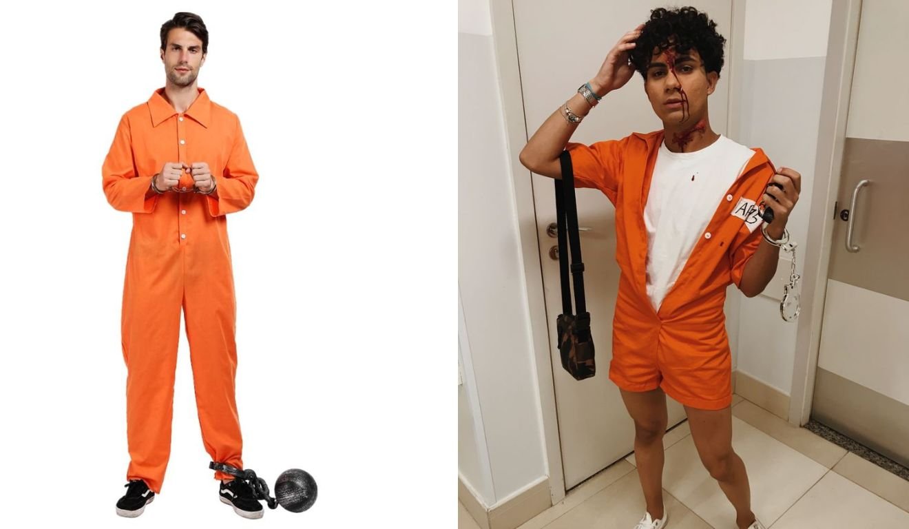 O que você precisa: Roupa laranja (macacão ou camiseta e calça) ou uma camiseta listrada em preto e branco.