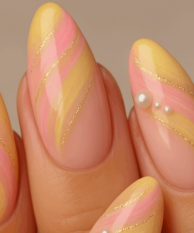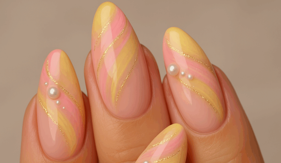 O último modelo traz uma mescla de rosa e amarelo nas pontas, com detalhes que lembram pinceladas artísticas. A presença de pequenas pérolas e o acabamento com aspecto pastel tornam o design ainda mais expressivo. As unhas se transformam em superfície de pintura, unindo referências de arte, moda e design gráfico. É uma opção marcante para quem gosta de experimentar combinações de cores pouco convencionais.