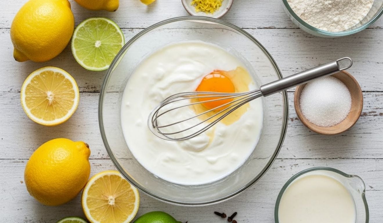 Em uma tigela espaçosa, comece a bater os ovos com o adoçante e o óleo de coco (ou azeite) até que a mistura fique homogênea. Em seguida, adicione o iogurte natural, o suco de limão e as raspas da casca de limão. Misture bem para que os sabores se incorporem.