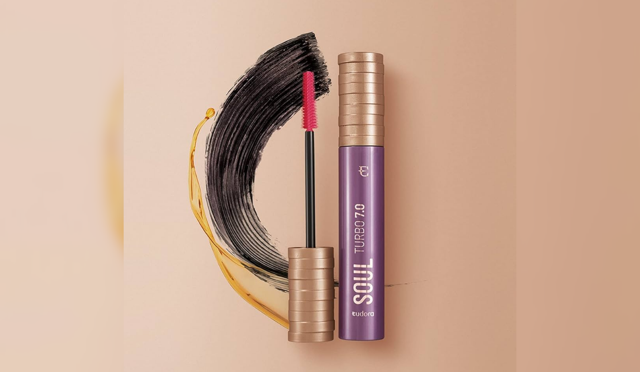 A linha Soul da Eudora apresenta a máscara Super Curl, desenvolvida para alongar os fios de forma visível. O diferencial está na escova curva, que ajuda a levantar e curvar os cílios desde a raiz. Essa característica proporciona efeito de “cílio de boneca”, com curvatura natural e abertura do olhar.