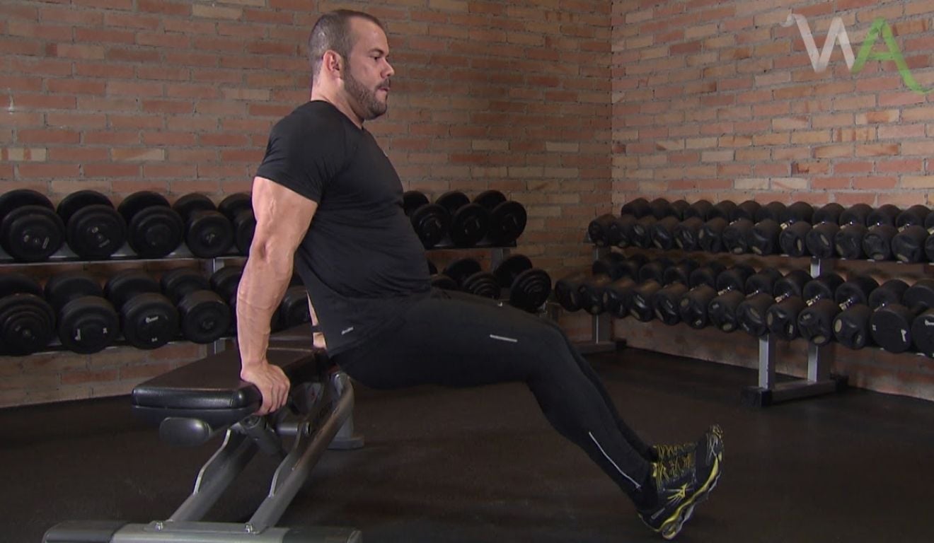 - Como fazer: Sente-se na borda de um banco ou cadeira firme. Coloque as mãos ao lado do quadril, segurando a borda. Deslize o quadril para a frente, tirando-o do banco. Flexione os cotovelos para trás (não para os lados), baixando o corpo até que os braços formem um ângulo de 90 graus. Empurre o corpo para cima. Mantenha os ombros relaxados e longe das orelhas.