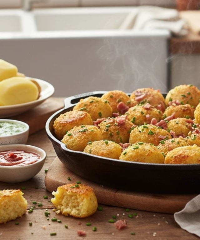 Pedaços pequenos de bacon ou presunto podem ser incorporados à massa, criando bolinhos mais encorpados e saborosos, perfeitos para acompanhar refeições ou servir como aperitivo.
