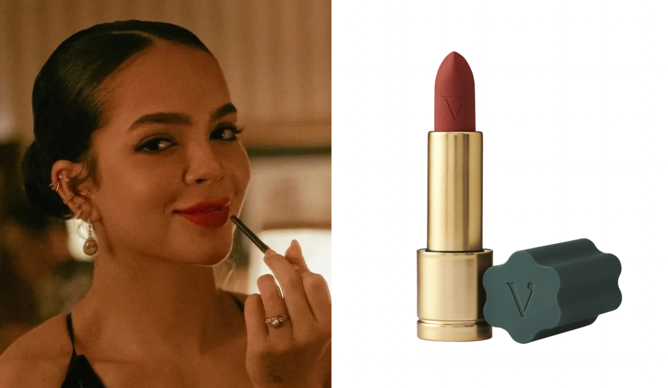 A combinação dos dois produtos cria uma boca elegante, com contorno definido e cor profunda — uma marca registrada da atriz na série.