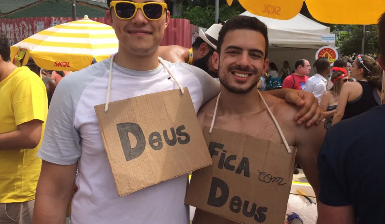 Expressões populares também viram fantasia quando transportadas para o Carnaval. A ideia do “Fica com Deus” costuma aparecer em grupos com placas, frases estampadas e referências religiosas tratadas com leveza e ironia. O visual geralmente é simples, mas a força da fantasia está na mensagem escrita, que dialoga diretamente com o humor cotidiano. Em meio à folia, é uma fantasia que chama atenção pela criatividade e pela comunicação direta com quem passa.