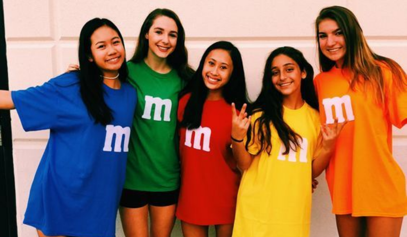 As fantasias inspiradas nos famosos confeitos coloridos são ideais para grupos que buscam praticidade e impacto visual. Camisetas ou vestidos em cores vibrantes, com a letra estampada no centro, resolvem o visual de forma rápida. O sucesso da fantasia está na combinação de simplicidade e reconhecimento imediato, além da possibilidade de incluir quantas pessoas forem necessárias, bastando variar as cores.
