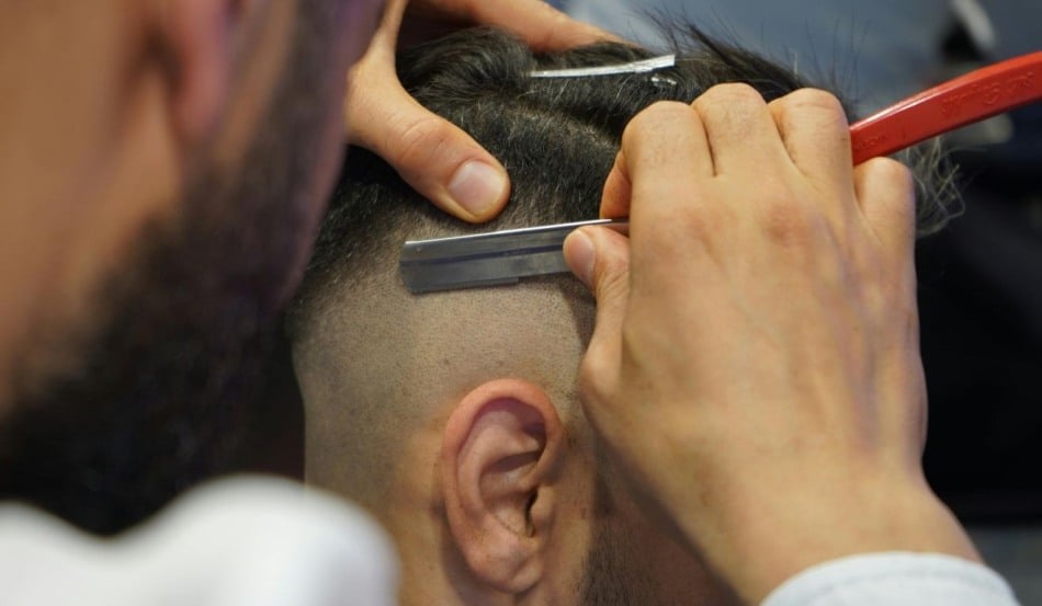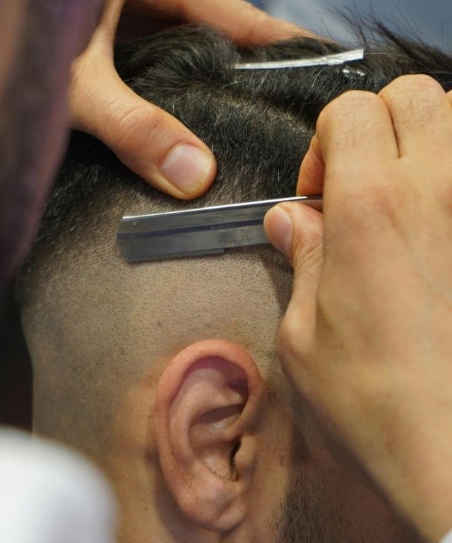 A finalização é feita com uma navalha ou lâmina na testa e nas têmporas, criando um contorno bem definido e geométrico. Este “desenho” da testa é o que dá o toque clean e o aspecto visualmente sharp (nítido) característico do estilo.