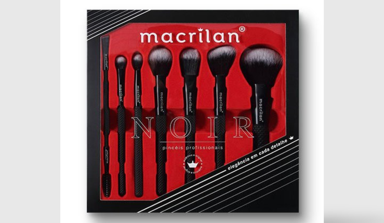 Reconhecida por oferecer pincéis com excelente custo-benefício, a Macrilan mantém seu destaque com o Kit Noir ED009, que reúne sete pincéis profissionais para aplicação completa da maquiagem. O conjunto é pensado para trabalhar com diferentes texturas de produtos, como bases líquidas, cremosas ou em pó, e oferece formatos variados para garantir precisão e acabamento impecável.