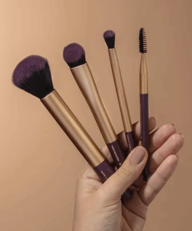 O conjunto inclui cinco pincéis em tamanho reduzido, mas com a mesma eficiência dos modelos tradicionais. Entre as funções, estão o pincel para base, pó, blush, sombra e detalhes. A proposta da marca é oferecer um kit completo, que cabe na nécessaire e pode ser usado para criar maquiagens simples ou elaboradas em qualquer lugar.