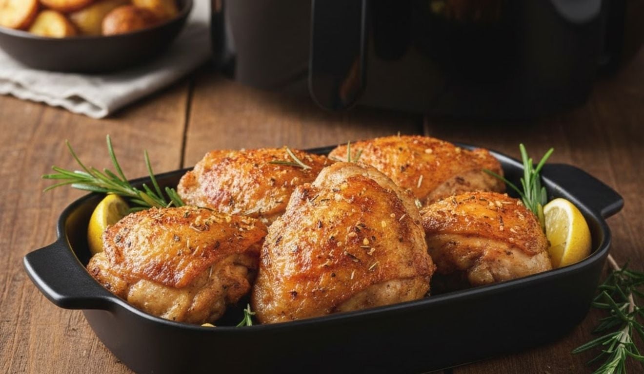 Entre as carnes mais populares na airfryer, a sobrecoxa de frango se destaca. A combinação de pele e gordura natural garante um resultado crocante por fora e extremamente suculento por dentro.