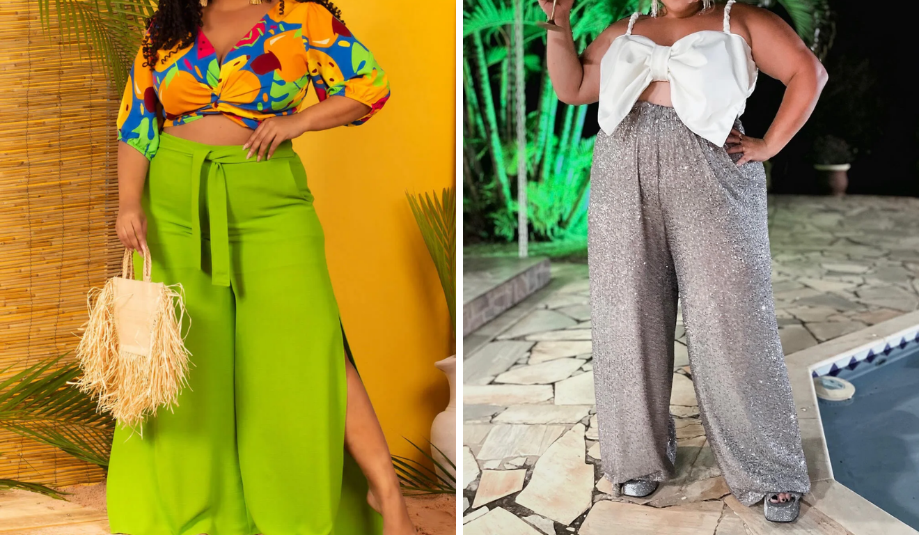 No plus size, essas calças criam um visual elegante e descomplicado, especialmente quando combinadas com tops mais curtos ou blusas leves. O resultado é um look fresco, confortável e adequado para quem quer fugir do óbvio.