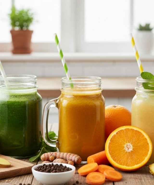 Além de gengibre, cúrcuma, couve e hortelã, você pode incluir beterraba, pepino, limão, maçã, abacaxi, laranja, cenoura e sementes como chia ou linhaça, aumentando o efeito antioxidante.