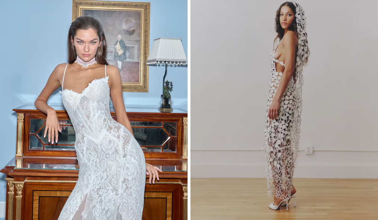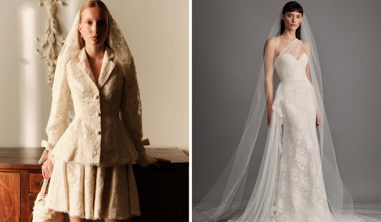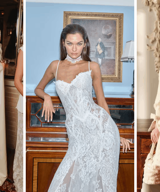A renda retorna com protagonismo absoluto. Tecidos elaborados criam superfícies ricas, que podem assumir duas direções distintas: a estética clássica, com desenhos intrincados e volumes suaves, e as interpretações contemporâneas, em que a renda aparece estruturada, acompanhada de cortes mais rígidos ou modelagens minimalistas.